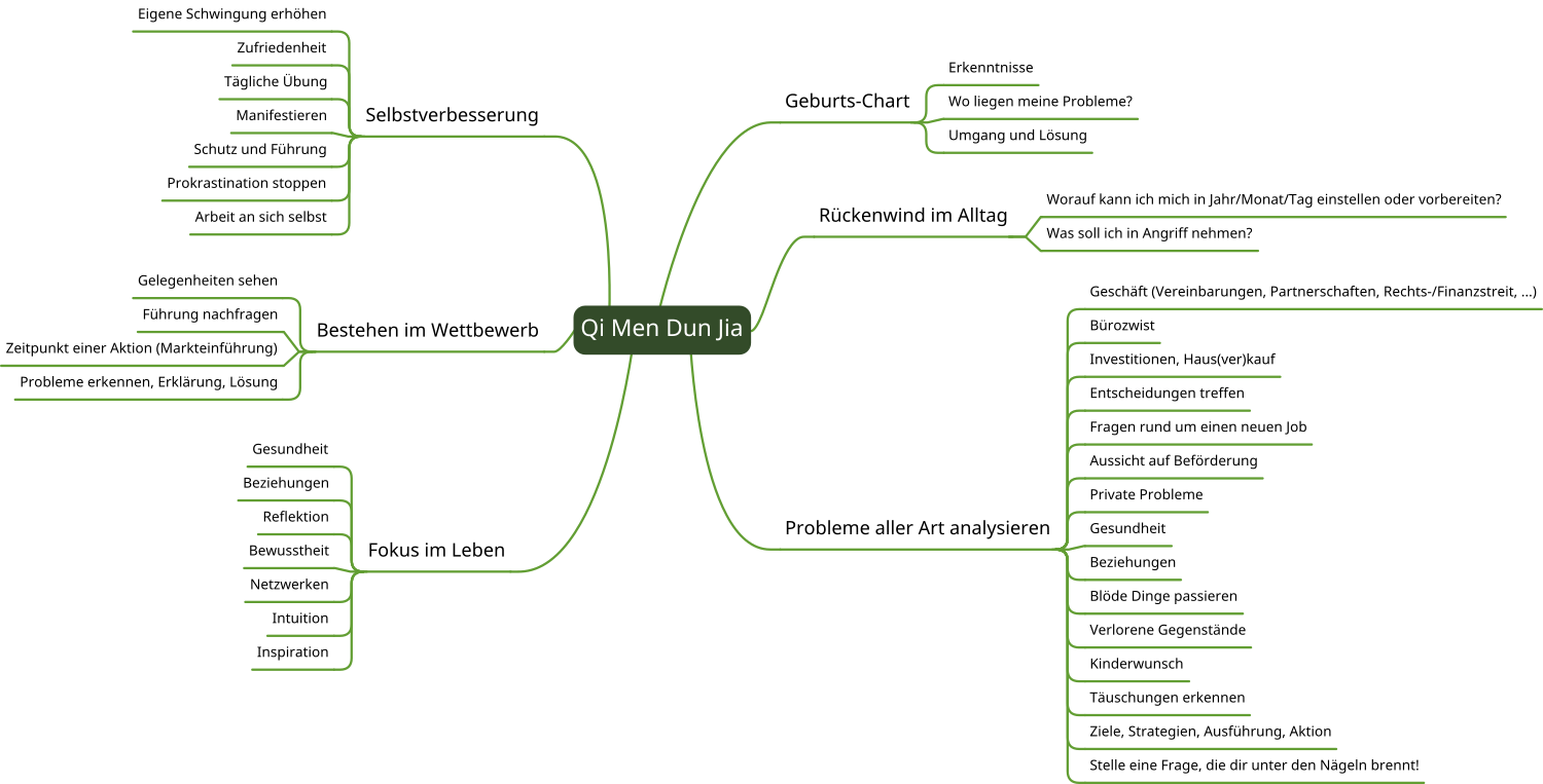 Neulich hat mich eine Freundin gefragt, was man denn mit diesem Qi Men Dun Jia machen kann. Ich sollte das mal kurz zusammenfassen. Hahaha, meine Themen eignen sich nicht so für eben kurz gesagt. Ich habe eine Mindmap zusammengestellt, um mir selbst darüber klar zu werden, was jetzt nach der fortgeschrittenen Ausbildung alles geht.